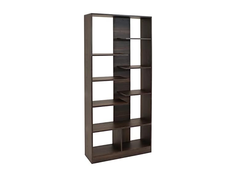 - Modern design: This staggered bookshelf features a coffee brown finish and an open back that contrasts your indoor living space. The display shelf is made from pine and eucalyptus thermofused MDF with polypropylene feet.