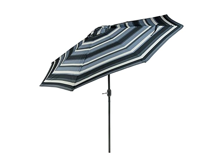 A patio umbrella with tilt and crank functionality is the answer to achieving shade on any patio, deck, or backyard area. Easily control exposure to the sun and remain comfortable while spending time outdoors sitting under this umbrella. Featuring a push-button tilt function, it's easy to maneuver the umbrella into the desired angle for maximum comfort. Plus, the crank makes it easy to open or close the umbrella. Make sure to tie back this umbrella in harsh weather conditions for long-lasting use. The large 9' umbrella diameter makes it just the right size for any 42"-54" outdoor dining table and chairs (not included). With a standard 1.5" opening base, use this umbrella with any favorite outdoor seating set! In addition, the umbrella is engineered to last with a black powder-coated aluminum pole for resistance to rust, steel ribs for maximum support, and 100% polyester fabric for the umbrella for extra durability and style!