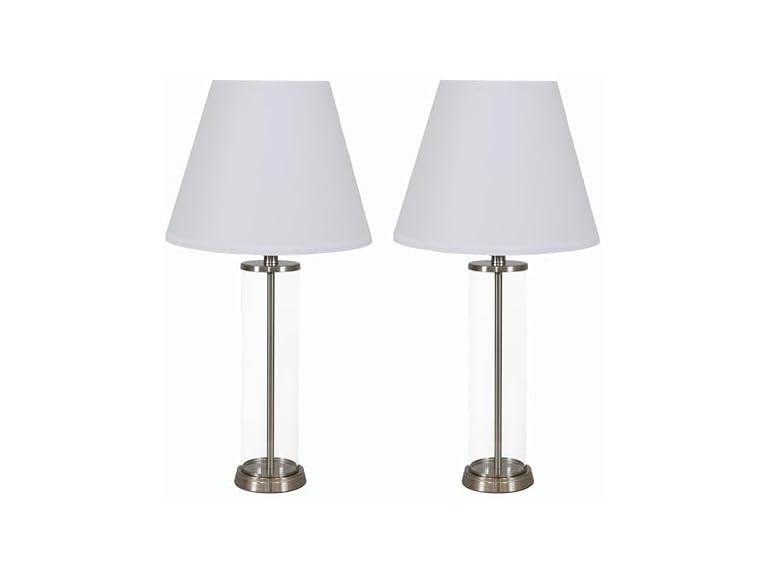 - INVITING AMBIANCE: Each bedside table lamp features a white cotton and polyester blend shade, a stainless steel frame, and an attractive glass base that creates a sophisticated and inviting atmosphere. An on/off switch located on the lightbulb socket makes the lamp easy to operate.