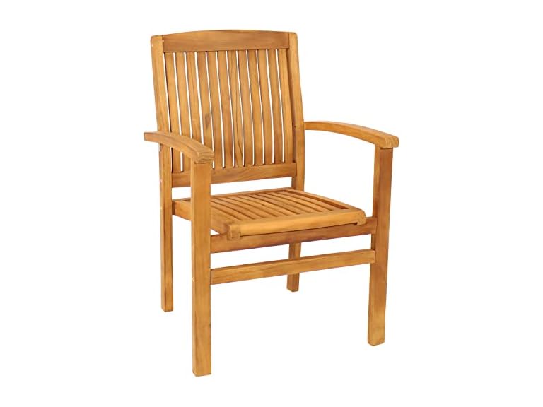 - CLASSIC WOOD DESIGN: This stacking outdoor chair is made from solid teak wood with a water-based, light brown finish for a classic appearance. Teak wood is strong enough to hold up against the elements. Refinishing the wood with a wood oil each season can help preserve its integrity and natural beauty.