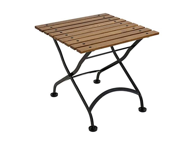 - BEAUTIFUL WOOD DESIGN: This foldable side table features a chestnut wood tabletop surface for a contemporary look and natural weather resistance and a durable 25 mm x 8 mm thick steel frame with an electrogalvanized undercoat followed by a powder-coated top coat with plastic foot cover glides to protect your floors. This table has large feet to prevent it from sinking into the grass, and all wooden parts are hand finished for a polished look.