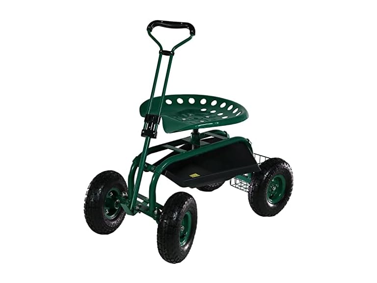 - TACKLE THE TERRAIN: This garden scooter with seat and wheels features a 360-degree swivel seat motion for complete rotation while working. Steel axles and pneumatic wheels ensure that this utility cart will last through many years of landscaping and outdoor projects.