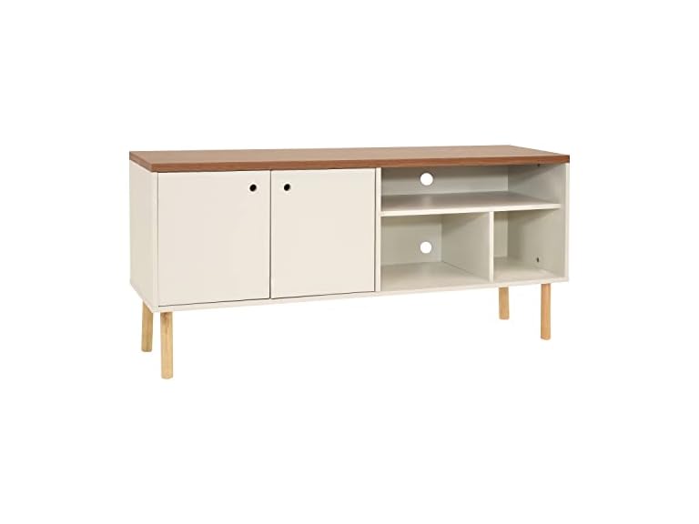 - STREAMLINED STYLE MEETS SMART STORAGE: Elevate any living space with a retro-inspired entertainment center that balances form and function. Designed for TVs up to 55", this mid-century modern stand features open shelving for consoles and decor, plus a spacious cabinet to conceal games, books, and media. Two built-in cable management holes keep wires tucked away for a clean, organized look.