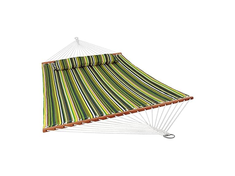 - COMFORTABLE AND STYLISH: This quilted hammock with pillow is made from dye-treated polyester material, which provides UV resistance to add longevity. The outdoor hammock also features hardwood spreader bars to hold its shape to make getting in it easier.