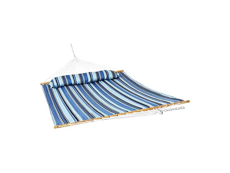 - COMFORTABLE AND STYLISH: This quilted hammock with pillow is made from dye-treated polyester material, which provides UV resistance to add longevity. The outdoor hammock also features hardwood spreader bars to hold its shape to make getting in it easier.