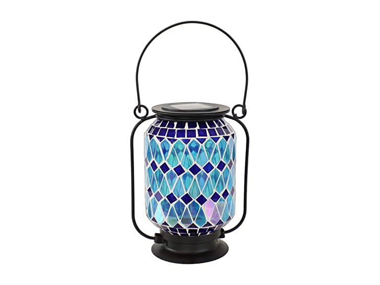 - INCLUDES 1 DECORATIVE LANTERN: This product includes 1 decorative glass solar lantern with a metal frame that features a handle. The built-in mosaic LED light provides gentle, soft accent illumination to create a cozy ambiance at night on the patio or porch.