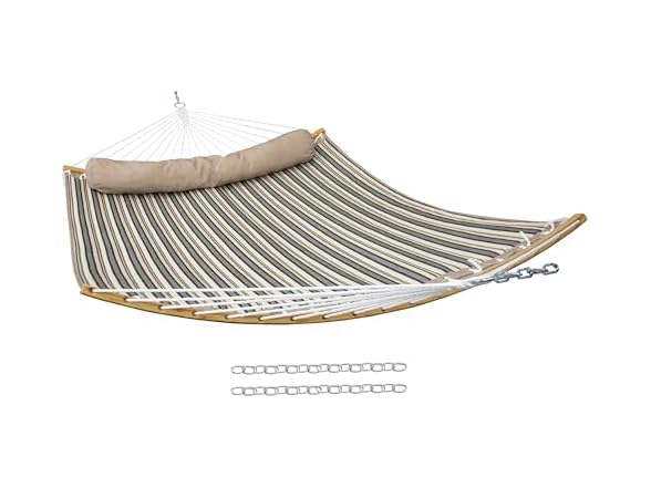 - Comfortable and durable: This quilted hammock is made from polyester fabric with a polyurethane foam fill for added comfort. The curved spreader bars are made from durable bamboo wood. Strong polyester ropes connect the hammock to the metal chains to hang the hammock from a stand (not included) or between trees.
