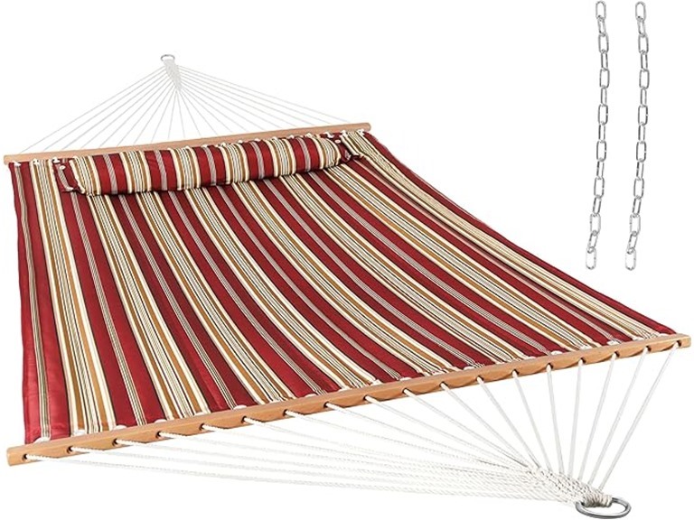 - COMFORTABLE AND STYLISH: This quilted hammock with pillow is made from dye-treated polyester material, which provides UV resistance to add longevity. The outdoor hammock also features hardwood spreader bars to hold its shape to make getting in it easier.
