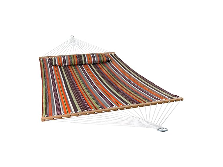 - COMFORTABLE AND STYLISH: This quilted hammock with pillow is made from dye-treated polyester material, which provides UV resistance to add longevity. The outdoor hammock also features hardwood spreader bars to hold its shape to make getting in it easier.