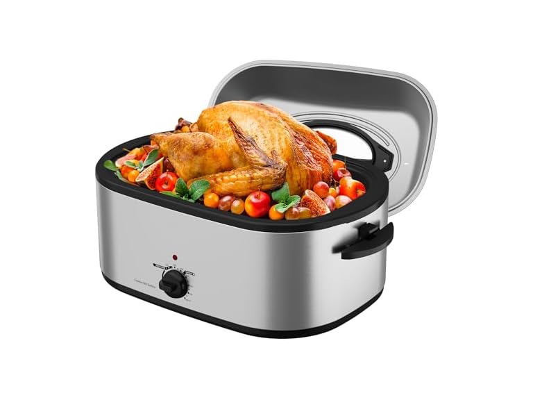 - 【Anti-Scaled & Easy to Clean】- The electric roaster is made of reinforced stainless steel, which is resistant to rust. Cool-Touch handles on the lid and body, can protect your hands; Removable insert pot, make thanksgiving roaster easier for you to clean it. Use the liner at temperatures below 350F and with water to avoid sticking the liner to the pan.