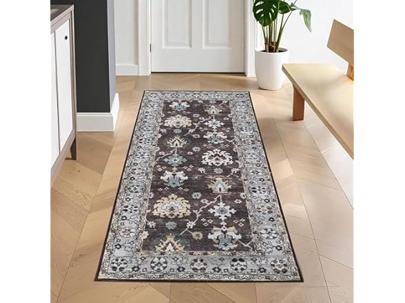 - (1) Superior Floral Geometric Border Washable Indoor Area Rug, 2'7"x6', Brown/ Grey