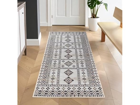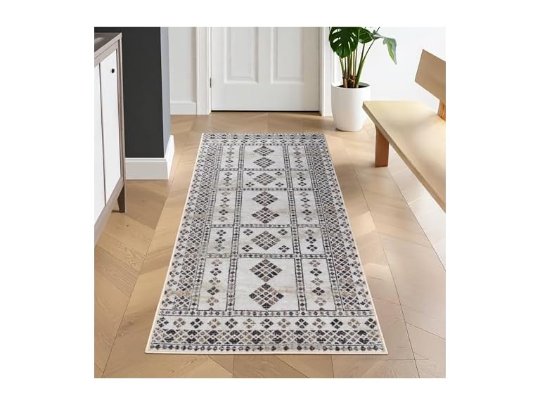 - (1) Superior Modern Diamond Border Washable Indoor Area Rug, 2'7"x6', Ivory