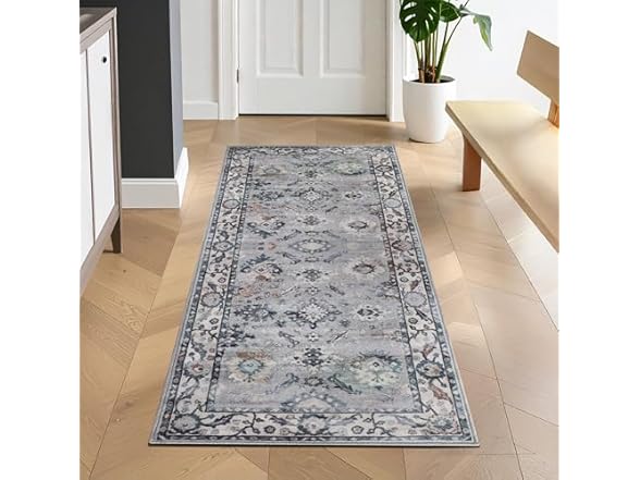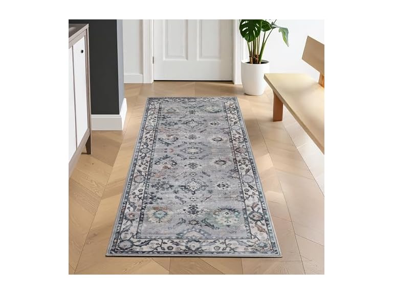 - (1) Superior Vintage Floral Border Washable Indoor Area Rug, 2'7"x6', Grey/ Ivory