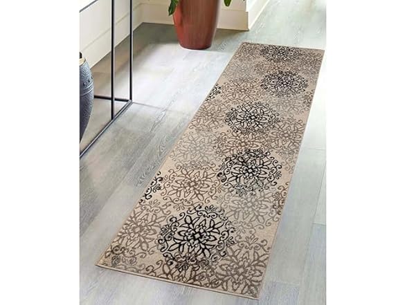- (1) Modern Floral Scroll Indoor Runner or Area Rug, 2'x11', Beige - Superior