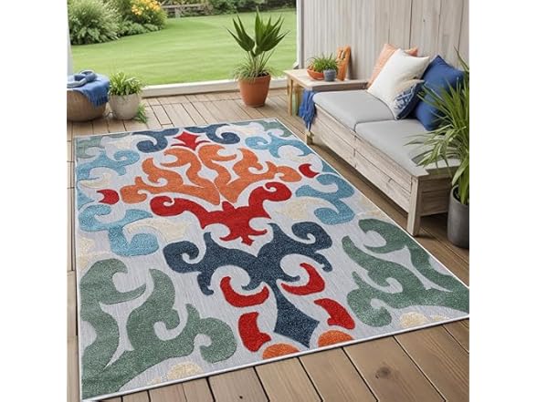 - (1) Superior Aldaine Indoor Outdoor Area Rug, Perfect for Patio, Poolside, Backyard, Playroom, Kitchen, Bedroom, Dining Room, Entryway, Mudroom, Vintage Damask Floor Cover, 8' x 10', Multicolor