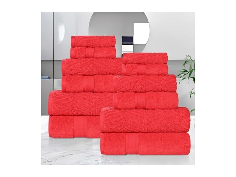 - (1) Superior Cotton Chevron 12-Piece Towel Set, Zero Twist, Quick Dry, Home Essentials, Shower, Spa, Luxury Plush Soft Absorbent Towels, Includes 4 Bath, 4 Hand, 4 Washcloth/Face Towels, Red