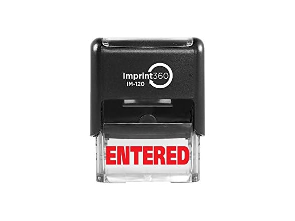 - Entered, premium self-inking rubber stamp, red ink