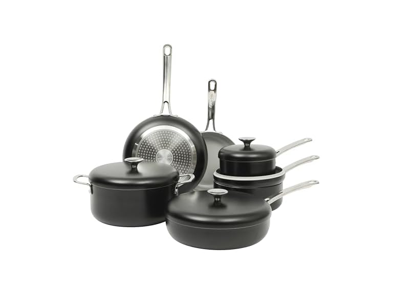 - Sur La Table Kitchen Essentials Potluck Porch 10 Piece PFA Free Ceramic Non stick Interior Forged Aluminum Cookware Pots and Pans Set W/Aluminum Lids - Black - Induction Compatible