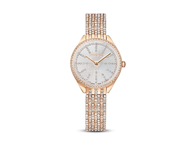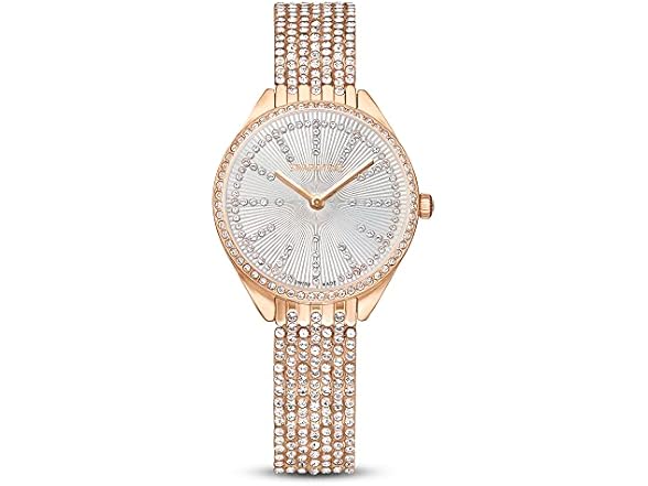 - Items delivered: (1) Swarovski Attract watch with guilloché dial, rose-gold tone casing and bracelet adorned with clear crystals, complete with Swarovski watch box