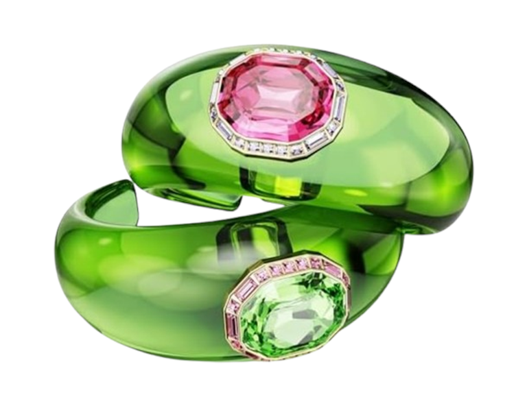 - The candy-inspired set features two open green bands, one with a central octagon-cut crystal in pink, and another with the crystal in green
