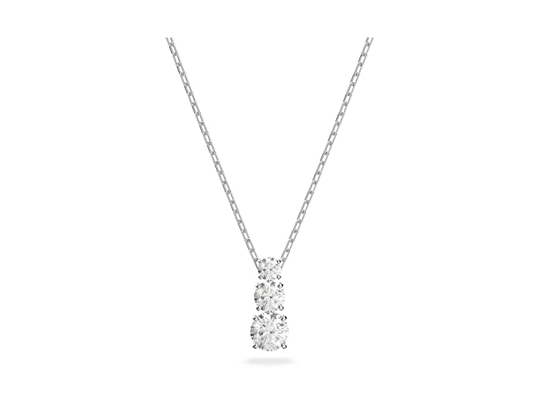 - Items delivered: 1 x Swarovski Stilla Attract Trilogy Collection round crystal and rhodium plated pendant, 14 7/8 inch thin rhodium plated chain, 1/4 x 3/8 inch crystal pendant, with Swarovski necklace box