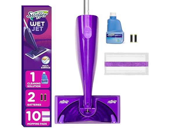 - (1) Swiffer WetJet Hardwood and Floor Spray Mop Cleaner Starter Kit, Includes: 1 Power Mop, 10 Pads, Cleaning Solution, Batteries