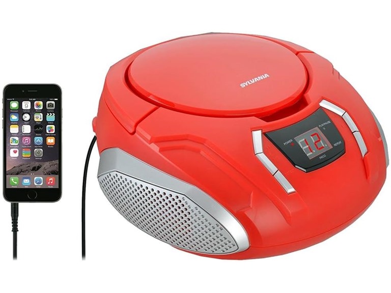 - Portable CD Boombox with AM/FM Radio in Fun Red Color