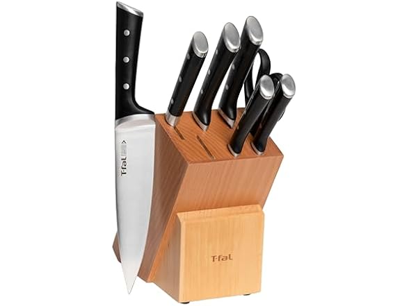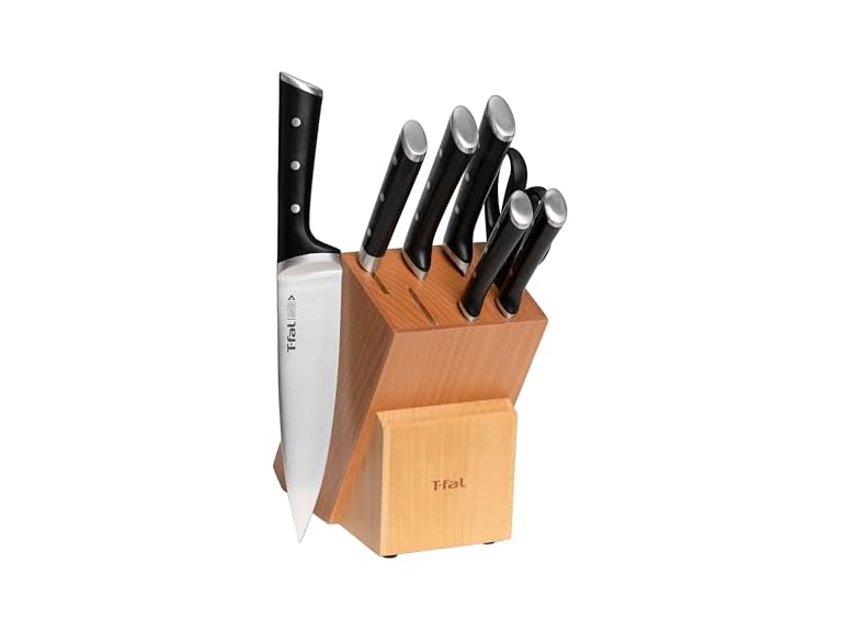 - T-fal Ice Force German Stainless Steel Kitchen Knife Set and Wood Block 8 Piece, Long Lasting Sharpness, High Cutting Precision, Superior Durability, Ultra Sharp Blades, Cookware Kitchen Gadget Black