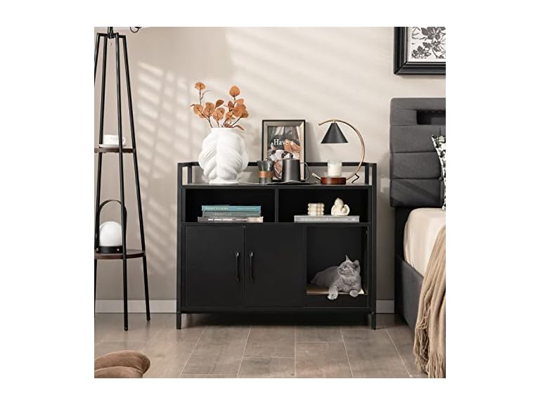- Tangkula Litter Box Enclosure, Cat Litter Box Furniture Hidden w/Metal Frame, Scratching Board, Storage Compartment, Wooden Cat Washroom, Indoor Cat House Side Table, Cat Box Cabinet (Black)