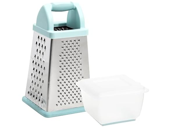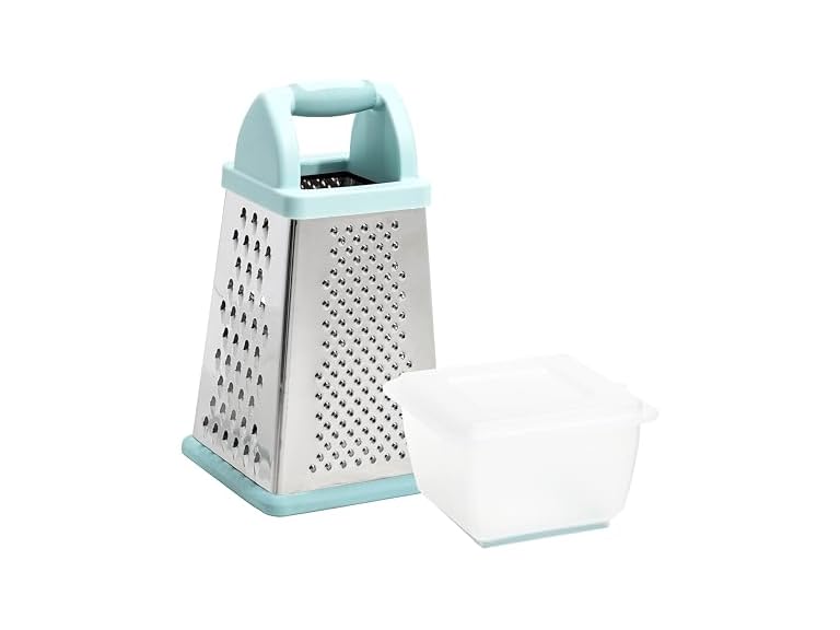 - Tasty Box Grater with Storage Container & Lid, Multi-Sided Stainless Steel Grater for Fine, Medium, Coarse Shreds & Slicing, Non-Slip Base, Dishwasher Safe, Aqua