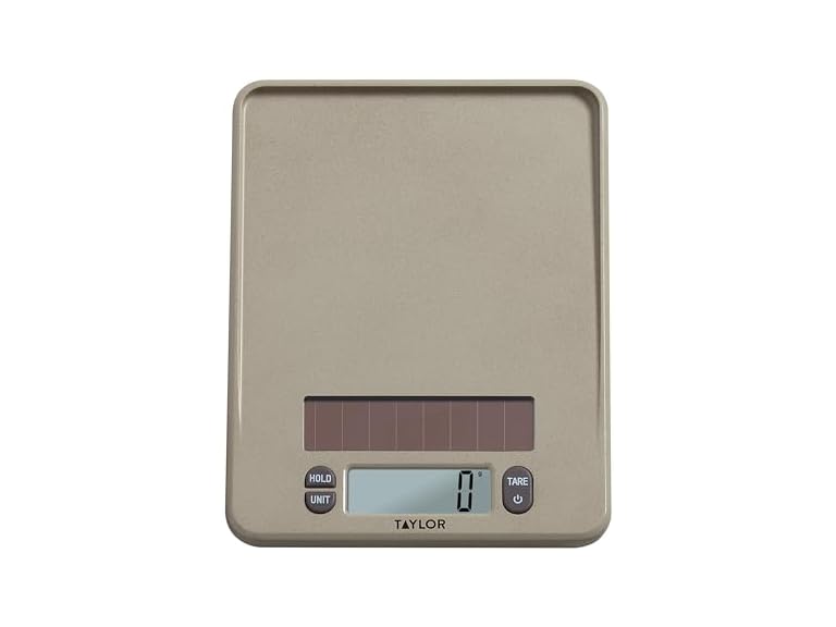 - (1) Taylor Light Powered Digital Kitchen Scale, Coffee Husk Blend Material, Solar Panel with Endless Power, No Batteries Needed, Energy-Saving, 11lb Capacity, Beige