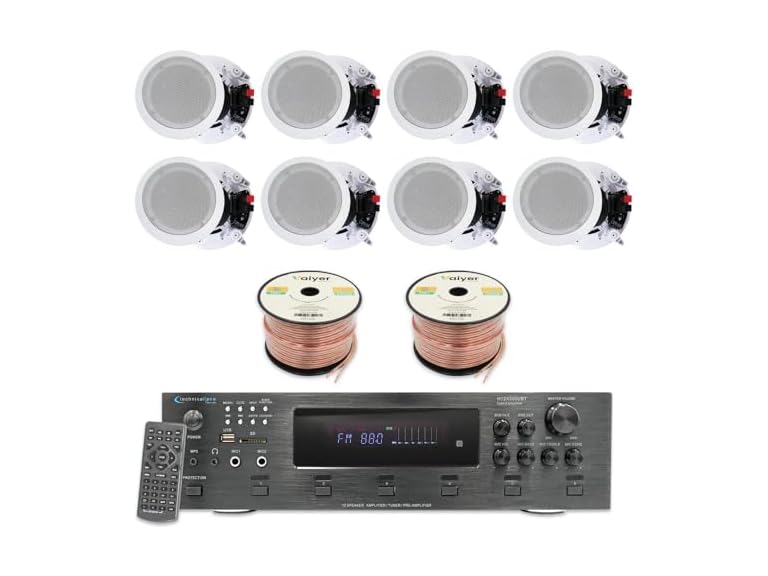- COMPLETE HOME THEATER KIT: Transform your audio experience with this comprehensive kit. Our home audio kit is perfect for improving your home theater systems. With easy installation, this kit includes everything you need a powerful home theater receiver, high-quality ceiling speakers & durable speaker wire. Perfect for enhancing the atmosphere in homes, offices, and restaurants, this system creates dynamic entertainment spaces that engage & delight your audience!
