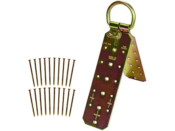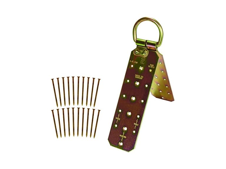 - Heavy-duty alloy steel plates and D-ring^Reusable when attached with screws^Holes marked for use with either nails or screws^Hinged design conforms to most roof peaks