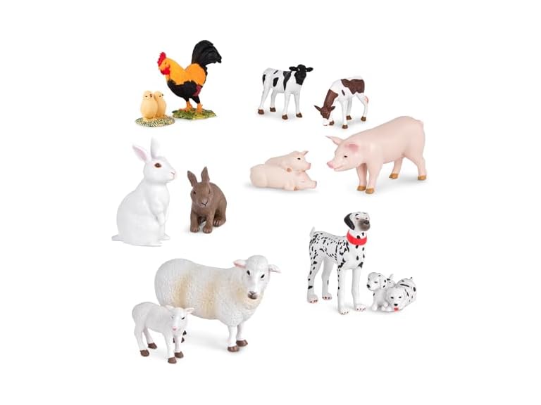 - 12-Piece Set: This set comes with 2 small calves, Dalmatian dog & pups, rooster & chicks, sheep & lamb, rabbit & bunny, and a pig with piglets.
