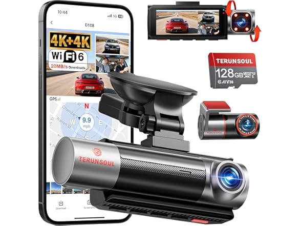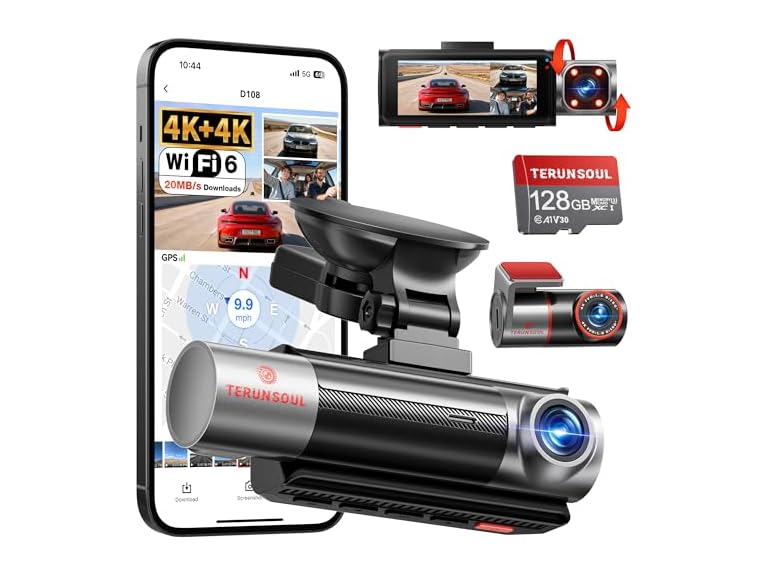 - Lightning-Fast Dual Band WiFi 6 & Free Wireless App Control: Comes with advanced dual-band WiFi 6 with 5.8GHz and 2.4GHz, the dash cam front and rear lets you instantly access, manage, and download ultra-clear 4K videos through the “Terunsoul App” on your iOS or Android device. Enjoy blazing-fast transfer speeds up to 20MB/s for seamless sharing on social media or sending footage to your insurance provider. You can also manage camera settings and update firmware seamlessly OTA via the App