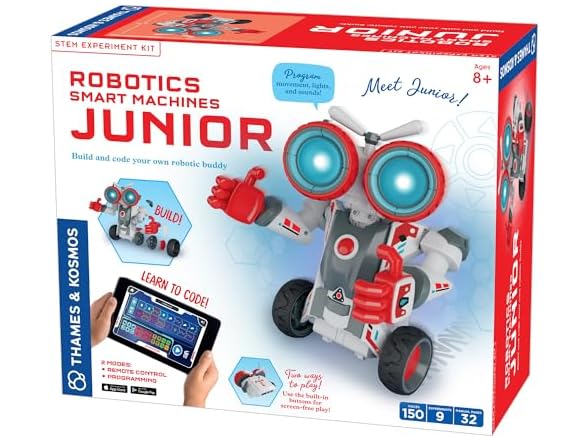 - Thames & Kosmos Robotics Smart Machines Junior STEM Kit, Build & Code Your Robot’s Movements, Speed, Lights & Sounds, for Ages 8+, Use Screen-Free w/Built-in Buttons or via Block-Based Coding App