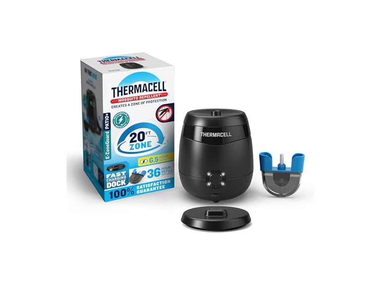 - SCIENTIFICALLY PROVEN MOSQUITO PROTECTION: Thermacell is scientifically proven to repel mosquitoes from a 20FT zone. Recommended by outdoor experts and trusted to work in the toughest mosquito environments. Comes in a convenient starter pack complete with a repeller, fast-charging dock, and 36 hours of refill.