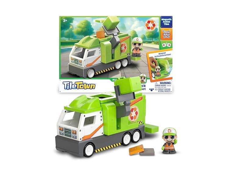 - (1) TILE TOWN Recycling Truck 15-Piece Magnetic Tile Playset, Interactive STEM Magnetic Tiles Toys, Includes 1 Action Figure and 2 Action Tiles