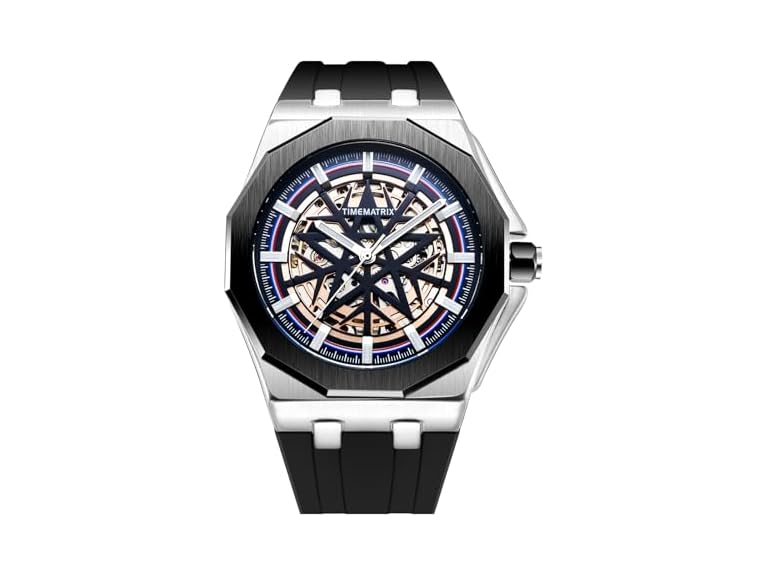 - (1) TIMEMATRIX Men's Mechanical Automatic Watch with Skeleton Movement Dial, Black Rimmed Case and Silicone Band, Luminous Hands, Five Pointed Star Series - TMX8350