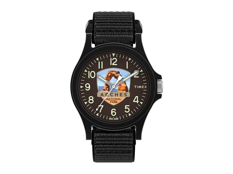 The Timex National Parks collection is a tribute to America’s wild spaces. This watch captures the vibrant energy and unique landscape of Arches National Park with a nostalgic dial illustration reminiscent of a vintage postcard. It’s built to equip you for adventure with a lightweight black resin case that allows you to focus on your journey without the distraction of heavy gear, as well as a FastWrap® hook and loop fabric strap for easy on-and-off. Durability in the outdoors is key, reinforced by a sturdy crown protector, 50 meters of water resistance, and a tough acrylic crystal. On the black dial, full Arabic markers provide easy time-telling at a glance, while luminous hands ensure visibility in low-light conditions should you find yourself exploring after dark. Finishing its playful design is a white arrow-shaped second hand that complements the graphic dial artwork.