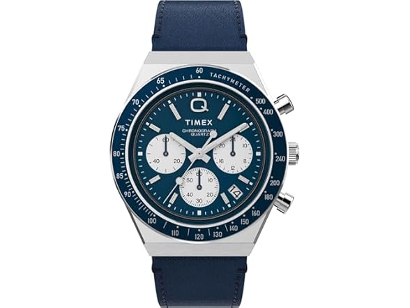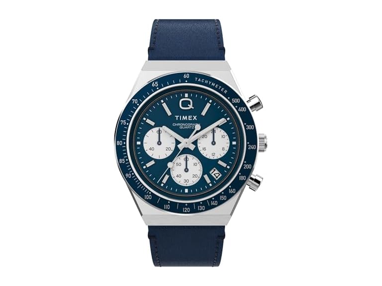 Roar across the finish line with our high-performing Q Timex® Chronograph. Inspired by the original motoring watches that graced the tracks of Europe’s most iconic races, this timepiece celebrates the endurance of our legendary 1970s Q Timex. An ultra-precise chronograph movement and tachymeter bezel recreate the finesse and function of a true racing watch, allowing you to determine elapsed time and average speed like the greatest daredevils in motorsports. Contrasting sub-dials, a date feature, hand-applied dimensional indices, and an updated Q Timex logo stand beautifully against a midnight dial, while a stainless-steel crown and brushed and polished 40mm stainless-steel case bring dynamism and durability to its retro construction. Infinitely wearable, it presents with a midnight natural leather strap sourced from the Leather Working Group® (LWG).