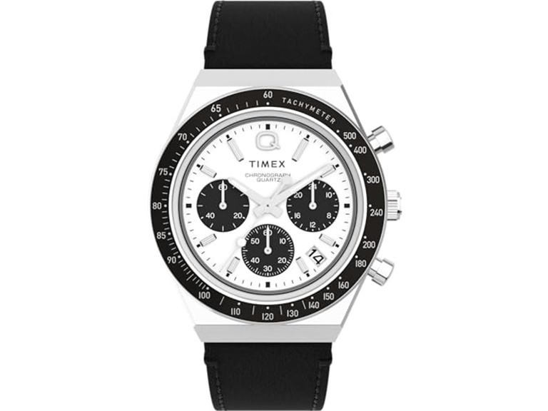 Roar across the finish line with our high-performing Q Timex® Chronograph. Inspired by the original motoring watches that graced the tracks of Europe’s most iconic races, this timepiece celebrates the endurance of our legendary 1970s Q Timex. An ultra-precise chronograph movement and tachymeter bezel recreate the finesse and function of a true racing watch, allowing you to determine elapsed time and average speed like the greatest daredevils in motorsports. Contrasting sub-dials, a date feature, hand-applied dimensional indices, and an updated Q Timex logo stand beautifully against a white dial, while a stainless-steel crown and brushed and polished 40mm stainless-steel case bring dynamism and durability to its retro construction. Infinitely wearable, it presents with a black natural leather strap sourced from the Leather Working Group® (LWG).