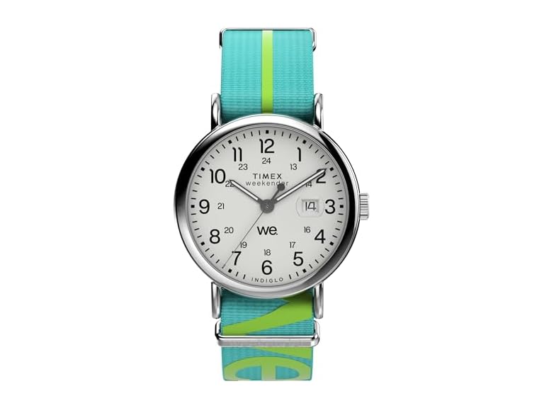 We’re bringing a fresh burst of energy to our beloved Weekender with elevated details, like a sleek new 40mm case, a new crown design, and an eco-friendly fabric strap branded with the iconic “we.” logo. The strap appears in a bright colorway and features a slip-thru design that makes it easy to swap it out for one in another color or print. This everyday watch is equipped with luminous hands and our INDIGLO® backlight, and on the white dial, you’ll find a date window complete with a magnifier for enhanced viewing, both 12- and 24-hour time indexes, and the Timex Weekender “we.” logo once again as a reminder that any boring old day can become unforgettable if it’s spent with our favorite people.