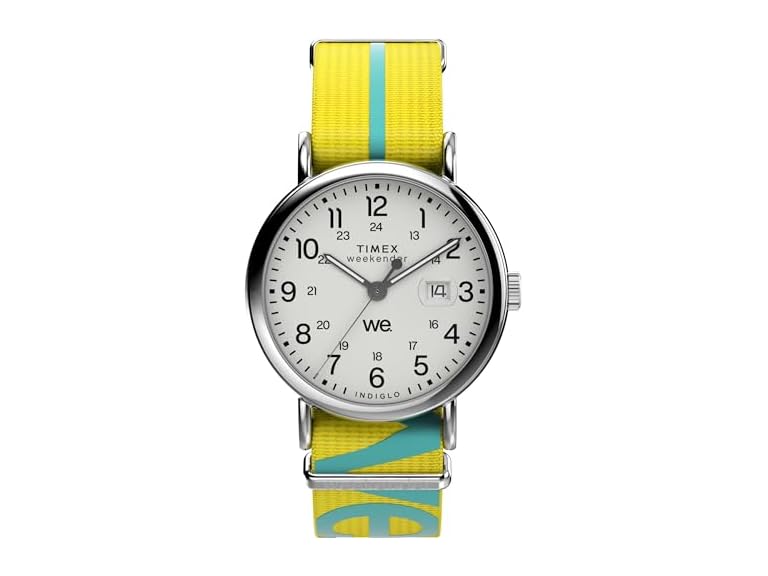 We’re bringing a fresh burst of energy to our beloved Weekender with elevated details, like a sleek new 40mm case, a new crown design, and an eco-friendly fabric strap branded with the iconic “we.” logo. The strap appears in a bright colorway and features a slip-thru design that makes it easy to swap it out for one in another color or print. This everyday watch is equipped with luminous hands and our INDIGLO® backlight, and on the white dial, you’ll find a date window complete with a magnifier for enhanced viewing, both 12- and 24-hour time indexes, and the Timex Weekender “we.” logo once again as a reminder that any boring old day can become unforgettable if it’s spent with our favorite people.