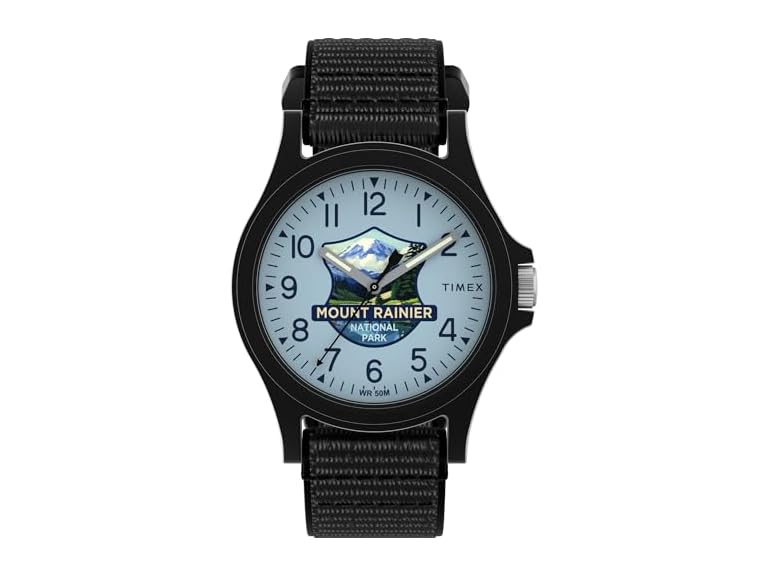 - Collect Them All: The Timex x National Parks collection is a tribute to America’s wild spaces. This watch captures the vibrant energy and unique landscape of Mount Rainier National Park with a nostalgic dial illustration reminiscent of a vintage postcard. Look for other iconic park designs to complete the collection