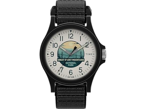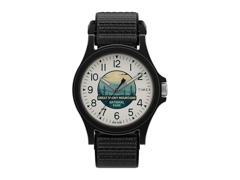 - Collect All Six: The Timex x National Parks collection is a tribute to America’s wild spaces. This watch captures the vibrant energy and unique landscape of Great Smoky Mountain National Park with a nostalgic dial illustration reminiscent of a vintage postcard. Look for other iconic park designs to complete the collection