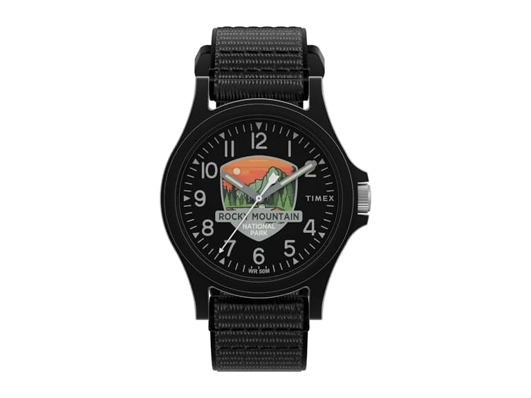 - Collect All Six: The Timex x National Parks collection is a tribute to America’s wild spaces. This watch captures the vibrant energy and unique landscape of Rocky Mountain National Park with a nostalgic dial illustration reminiscent of a vintage postcard. Look for other iconic park designs to complete the collection
