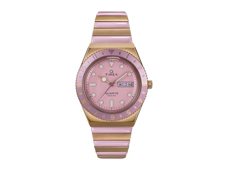 - Pretty in Pastel - This fresh update to our Q Timex offers a soft pastel colorway, with the dial and unidirectional bezel appearing in sweet shades of pink.