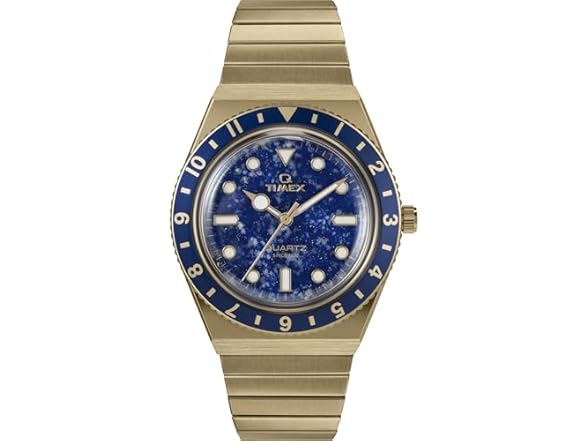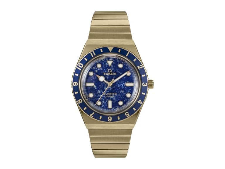 Our Women’s Q Timex brings the healing energy of the earth to your everyday look with brilliant blue lapis lazuli stone dial. Believed to cleanse the body of stress and promote spiritual growth, natural lapis lazuli features a deep blue coloring—often with flecks of golden pyrite—that makes each dial as one-of-a-kind as you. The brushed and polished 36mm gold-tone stainless-steel case is accented with a navy bezel that beautifully complements the rich, earthy tones of the dial, and we’ve paired this beauty with our Perfect Fit stainless-steel expansion band for a hassle-free, custom fit. Echoing the heritage of our original Q Timex 1979 Reissue, this timepiece also boasts iconic features like a rotating bezel, functional battery hatch, and domed acrylic crystal.
