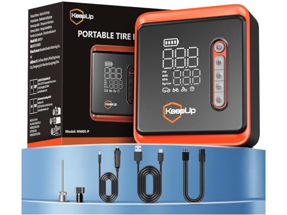 - 5X Fast Inflation Portable Tire Inflator:KEEPUP car tire pump equipped with a high-efficiency motor can provide 150 PSI max pressure and 34 L/min airflow. Inflate an E-bike in 30 seconds (10-20 PSI) and a car tire (205/55 R16) in less than 5 minutes, 5x faster than other car tire air pumps. Additionally, a 11.5ft power cord car charger included for added convenience.